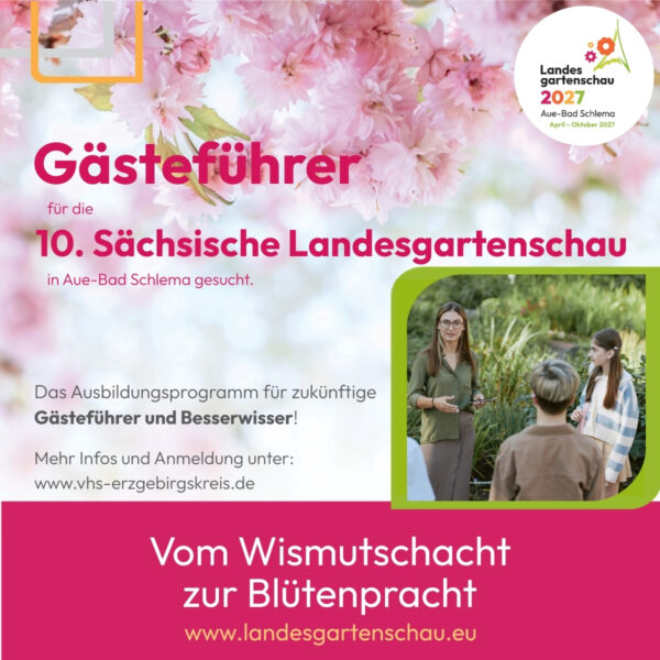 Jetzt Gästeführer für die Landesgartenschau 2027 werden! Ausbildung in Aue‑Bad Schlema mit Fachwissen, Rhetorik & Praxis. Jetzt anmelden.